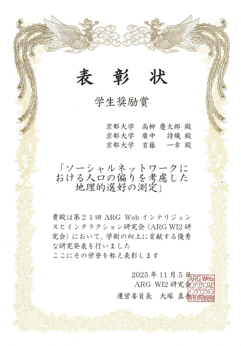 高柳 慶太郎, 廣中 詩織, 首藤 一幸: “ソーシャルネットワークにおける人口の偏りを考慮した地理的選好の測定”, ARG第21回Webインテリジェンスとインタラクション研究会, 2025年11月2日、4-5日.